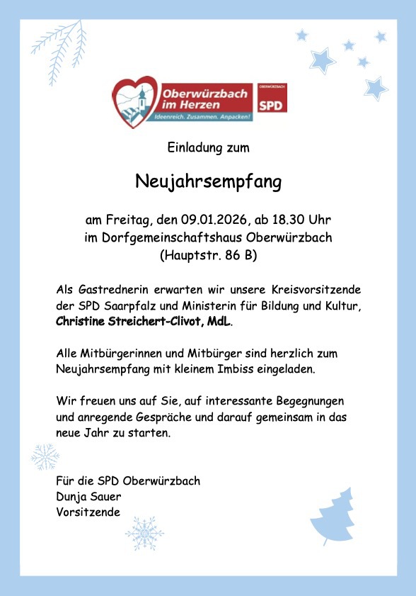 Die SPD Oberwürzbach lädt am Freitag, 09.01.2026 ab 18:30 zum Neujahrsempfang ins Dorfgemeinschaftshaus ein. (..mehr)