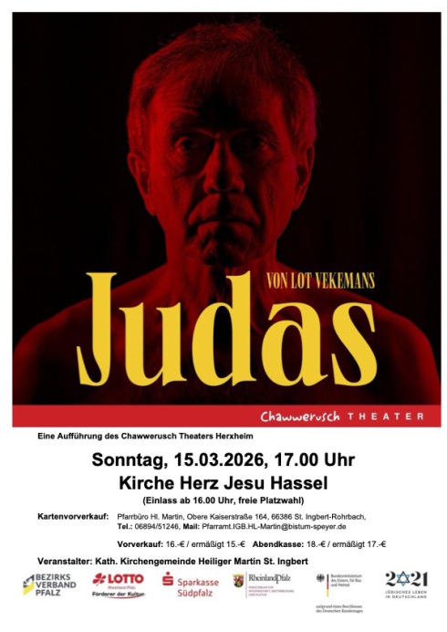 In der Fastenzeit gastiert am 15. März 2026 das Chawwerusch Theater Herxheim in der Kirche Herz Jesu Hassel mit dem Theaterstück „Judas“. Schauspieler Ben Hergl bringt uns die Figur des Apostels Judas näher.