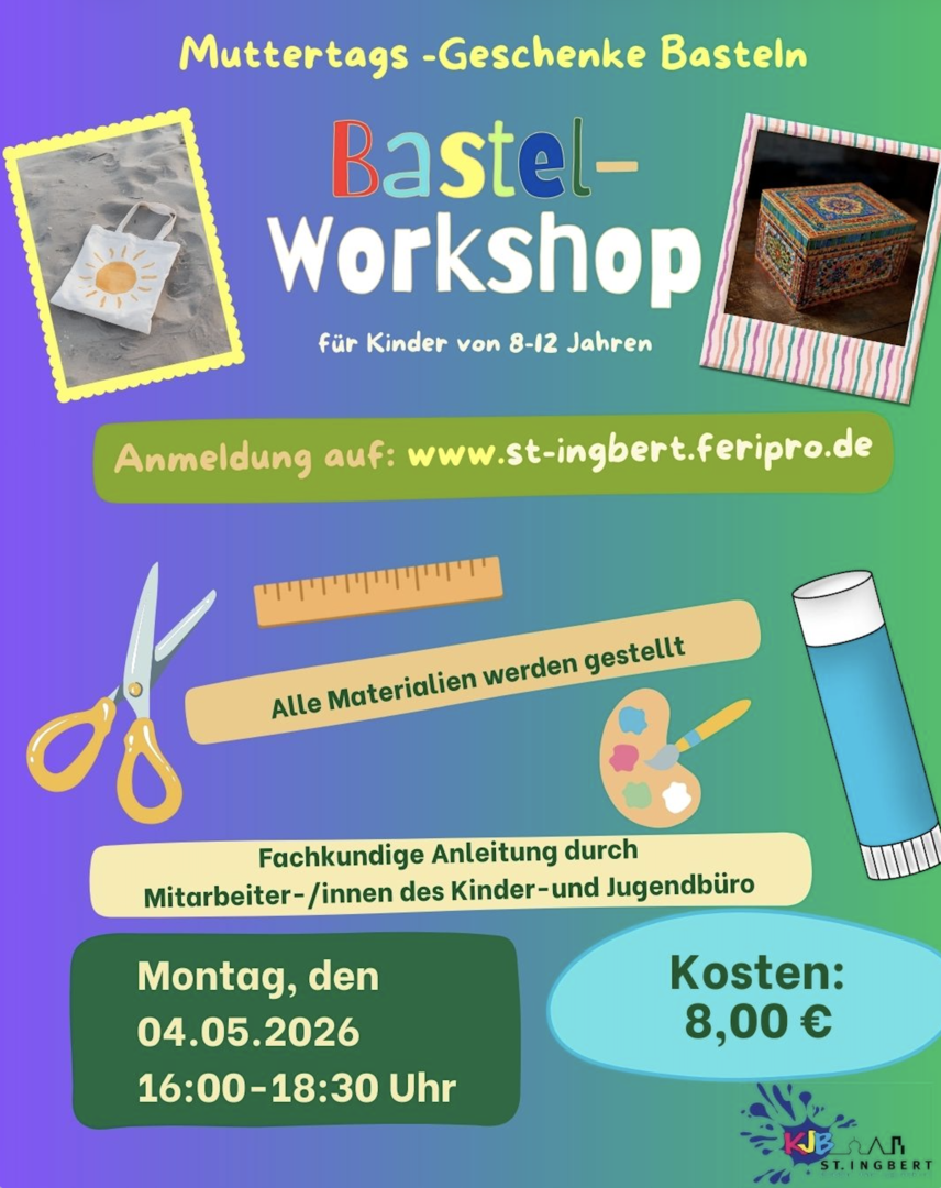 Das Kinder- und Jugendbüro der Stadt St. Ingbert lädt Kinder im Alter von 8 bis 13 Jahren zu einem kreativen Bastelworkshop anlässlich des Muttertags ein.