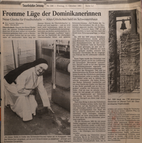 Der Bericht aus der "Saarbrücker Zeitung" vom Oktober 1991 enthält einen sachlichen Fehler. Die Glocke war von 1968 bis 1971 im Kirchturm von St. Chrodegang in Reichenbrunn eingebaut. Von 1971 bis 1991 war sie im Turm der Friedhofskapelle eingebaut.