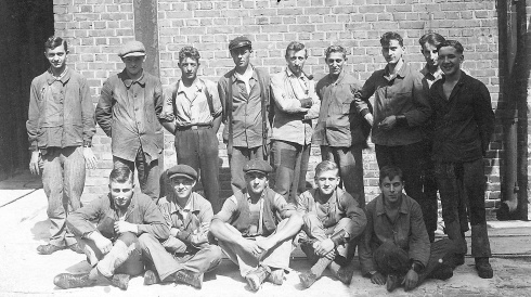 Das große Foto zeigt einen Teil der gutgelaunten Belegschaft der Lautzentalglashütte im Jahr 1928. Der Mann links mimt Charly Chaplin nach. Zwei der Arbeiter tragen Ledergurte über den Schultern, mit denen sie die Glasscheiben transportierten. Einige der Glasmacher tragen noch die Lederarmbänder, die sie bei der gefährlichen Arbeit zum Schutz der Pulsadern trugen. Der Glasschneider Ruprecht Rummler sitzt links unten.