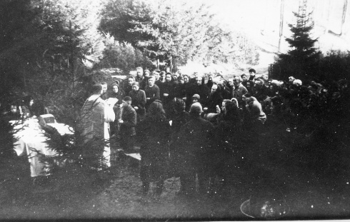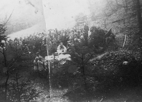 Ein Mönch zelebriert vor der Bunkeranlage eine Messe. Im rechten Bildrand liegt ein Berg „Rummele“, Viehfutter für die Kühe. Der Eingang zum Stollen wurde nach dem Krieg gesprengt und ist nicht mehr zu finden. (foto: privat)