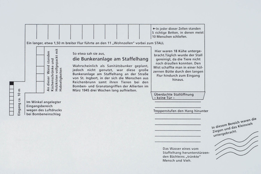 Die ursprünglich für militärische Zwecke gebaute Bunkeranlage am Staffelhang zwischen Oberwürzbach und St. Ingbert diente den Reichenbrunnern samt ihrem Vieh im März 1945 als wochenlanger Unterschlupf zum Schutz vor Bomben. Hinter der Schulter des Mönches