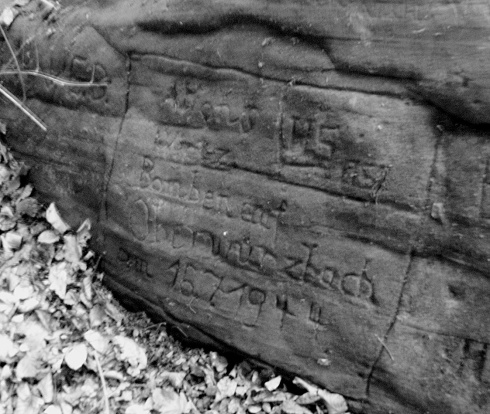 Alfons Wirtz war damals ein 11jähriger Lausbub. Er verarbeitete das Erlebnis, indem er das Datum des Angriffs in den Felsen einmeißelte.
