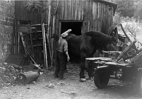 Peter Hager beim Striegeln eines seiner Zugpferde. Ein Fuhrmann brauchte zum Ziehen der schweren Lasten kräftige Pferde. Die Pferde der „Järr-Franze“ in St. Ingbert (doch das ist eine andere Geschichte) und auch in Oberwürzbach waren für ihre Stärke bekannt. Sie haben ein bis heute in St. Ingbert geläufiges, geflügeltes Wort geprägt. – Hatte ein „Weibsbild“ einen besonders ausgeprägten Hintern, so hieß es von ihr: